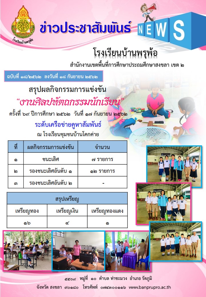 สรุปผลกิจกรรมการแข่งขัน“งานศิลปหัตถกรรมนักเรียน”ครั้งที่ 69 ปีการศึกษา 2562 วันที่ 17 กันยายน 2562