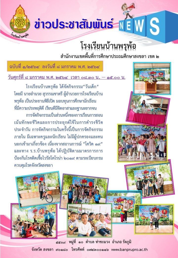 วันศุกร์ที่ ๘ มกราคม พ.ศ. ๒๕๖๔ โรงเรียนบ้านพรุพ้อ ได้จัดกิจกรรม“วันเด็ก”