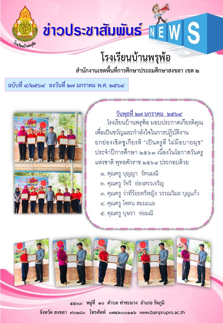 วันพุธที่ ๒๗ มกราคม ๒๕๖๔ โรงเรียนบ้านพรุพ้อ มอบประกาศเกียรติคุณ เพื่อเป็นขวัญและกำลังใจในการปฏิบัติ