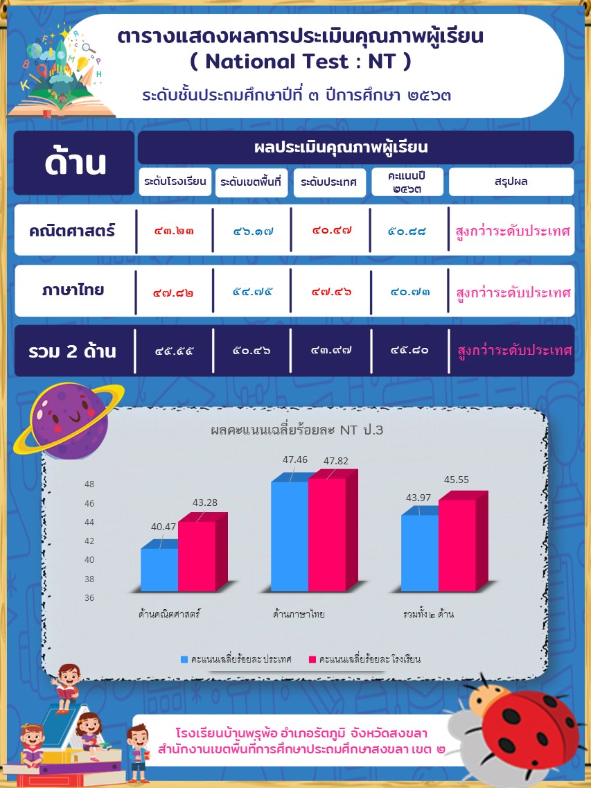 ผลการประเมินคุณภาพผู้เรียน ( National Test : NT ) ระดับชั้นประถมศึกษาปีที่ ๓ ปีการศึกษา ๒๕๖๓